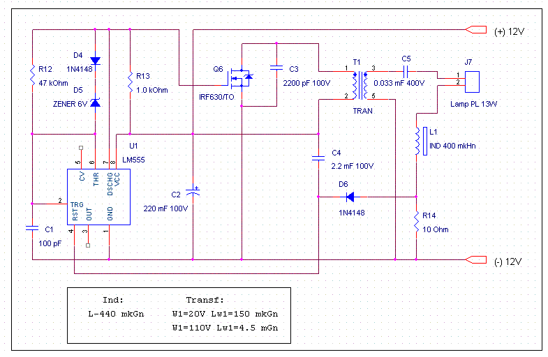 Представленая схема преобразователя для ламп дневного света предназначена для работы с лампами типа PL мощностью 13W два выходных контакта. В качестве источника питания может применяться любая аккумуляторная батарея номинальным напряжением 12 вольт или любой другой источник питания. Учитывая, что выходное напряжение в импульсе около 200 вольт необходимо при сборке и эксплуатации соблюдать все правила и требования техники безопасности.