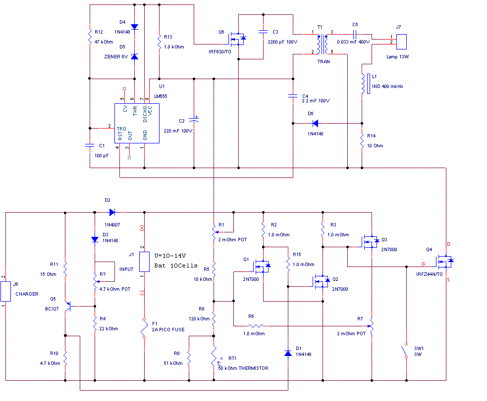 Представленая схема преобразователя для ламп дневного света предназначена для работы с лампами типа PL мощностью 13W два выходных контакта. В качестве источника питания может применяться любая аккумуляторная батарея номинальным напряжением 12 вольт или любой другой источник питания. Учитывая, что выходное напряжение в импульсе около 200 вольт необходимо при сборке и эксплуатации соблюдать все правила и требования техники безопасности. К преобразователю добавлен контроллер, который выключает лампу при понижении напряжения на батарее ниже 10 вольт, при включении лампы в режим заряда. Индуктивность L1 L-440 mkGn, Трансформатор Т1 W1=20V Lw1=150 mkGn, W2=110V Lw2=4.5 mGn