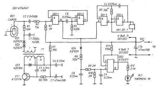 Фрагмент схемы, включающий в себя элементы DD1.3, DD1.4, С4 и R5, представляет собой управляемый по входу 6 DD1 звуковой генератор, возбуждающийся на частоте F@1/2·R5·C4@1 кГц, к парафазному выходу которого (выходы 3 и 4 DD1) подключен пьезоизлучатель НА1. Акустический импульс-щелчок возбуждается в нем «пачкой» электрических импульсов.