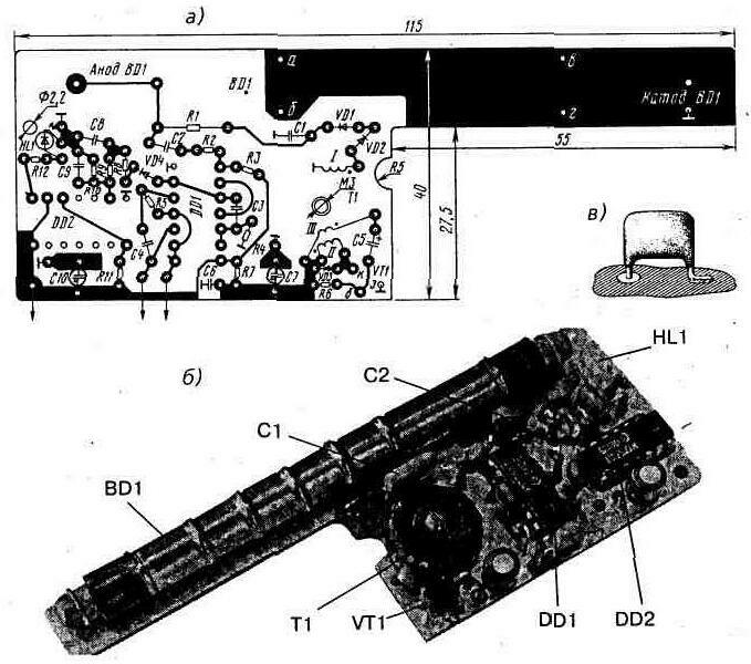 Прибор монтируют на печатной плате, изготовленной из двустороннего стеклотекстолита толщиной 1,5 мм (рис. 69, а). Фольга обратной стороны используется лишь в качестве нулевой шины (она соединена с «-» источника питания), в местах пропуска проводников в ней вытравлены кружки диаметром 1,5...2 мм.