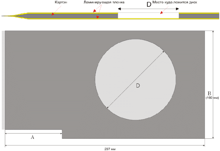 На верхнем рисунке - вид в разрезе (серым цветом обозначен картон, желтым - ламинирующая пленка). "D" - диаметр диска. Место, куда ложится диск. "В" - ширина подложки. Ширину вы можете подобрать сами, по расстоянию между выступами в блоке затяжки, которые и будут направлять подложку и не дадут ей сместится (люфт). "А" - расстояние между началом подложки и выступом, который будет определять начало "бумаги", для каждой модели принтера может быть различным. "А" - определяется примерно следующим образом, это расстояние между флажком датчик начала бумаги и край листа бумаги который лежит в лотке +1,5-2 см. для надежности.