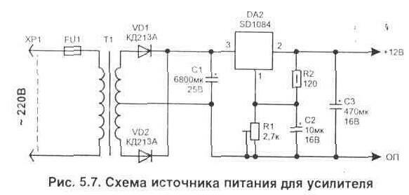 Для выполнения источника питания усилителя идеально подходит трансформатор типа ТП60-17 и регулируемый стабилизатор LT1084, рис. 5.7.