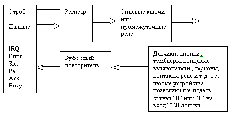 Байты данных для вывода устанавливаются в порт 378Н. Затем через 0,5 мс линия СТРОБ переводится с высокого в низкий уровень, после чего происходит запись информации во внешнее устройство. Входные сигналы удобно считывать с порта 379Н. Доработка компьютера до возможностей управляющего контроллера.Исходя из низкой нагрузочной способности параллельного адаптера, логично построить некий Модуль Согласования (МС), который будет принимать, хранить, усиливать управляющий сигнал и осуществлять управление. Одновременно МС может принимать внешние входные сигналы, их преобразовывать и передавать в компьютер. Очевидно, что простейшая схема МС будет иметь конфигурацию 8 выходных сигналов (каналов управления), 6 - входных, как показано на структурной схеме МС. ![]() ![]() | ||||||||||||||||||||||||||||||||||||||||||||||||||||||||||||||||||||||||||||||||||||||||||||||||||||||||||||||