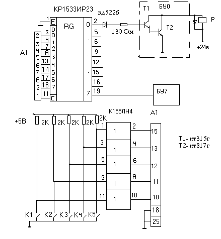 МС подключается к параллельному порту ПК стандартным "принтерным" кабелем Cetronix, обозначен на схеме - А1, с указанием контактов разъема адаптера. Датчики К1-К5 работают на замыкание. Микросхема К155ЛН4 служит для некоторой защиты адаптера от неблагоприятных внешних воздействий (в случае чего, проще заменить одну микросхему, чем весь адаптер). Можно использовать и другие элементы типа ЛН той же серии, например 155ЛН1, 155ЛН2, но в таком случае при обработке сигнала надо будет учитывать инверсию. При замыкании одного из ключей К1 на соответствующем входе логического повторителя высокий уровень сменяется низким, и на вход адаптера поступает сигнал изменения внешнего воздействия и заносится в порт 379Н, либо в 37АН (сигнал "разрешение прерывания") и затем обрабатывается программой. В ответ на внешние воздействия компьютер в соответствии с алгоритмом вырабатывает управляющие сигналы. Управляющая информация записывается по шине данных в регистр RG после прохождения стробирующего сигнала на вход С микросхемы КР1533ИР23. ТТЛ выход регистра защищен диодами КД522Б и резистором номиналом 130 Ом. Затем сигнал усиливается блоком усиления БУ0-БУ7, собранным в виде транзисторного ключа на элементах Т1,Т2. Напряжение питания на транзисторный ключ подается в зависимости от применяемого реле от +5 до +24В. Реле РП21 или аналогичные. Напряжение питания микросхем +5В. Вот и вся аппаратная часть. Можно приступать к программному обеспечению. При программировании управляющего сигнала нужно иметь в виду, что управление осуществляется сразу по всей шине данных. Например, если вначале был включен бит DАТА 0 (десятичный код 1, двоичный- 000000001), а затем возникла необходимость включить бит DАТА 1, не выключая DАТА 0, то надо подавать управляющий сигнал = 3 (00000011 двоичный). При управляющем сигнале=2 (00000010) произойдет отключение бита DАТА 0. Нужно также иметь в виду, что некоторые языки на прямую не поддерживают двоичный формат, поэтому, например в BASIC, все необходимые управляющие сигналы надо привести к десятичному формату. Входной сигнал считывается из МС в порт 379Н. Значимыми являются 4,5,6,7,8 биты порта. Опять же при необходимости надо привести входной сигнал к двоичному формату. Управление портами осуществляется по алгоритму: