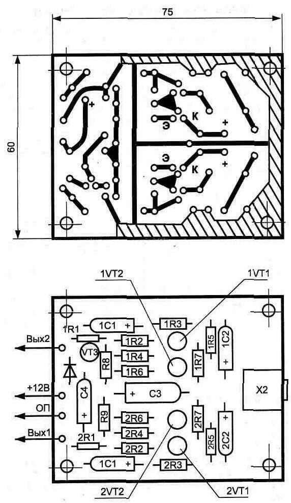 Топология печатной платы и расположение на ней элементов показаны на рис. 6.11.