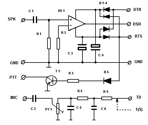 На вход операционного усилителя подаётся НЧ сигнал с выхода трансивера. Минимальный уровень данного сигнала должен быть не менее 100 мВ. Выходной сигнал с операционного усилителя поступает на контакт DSR (Data Set Ready).