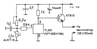 После длительной работы в спорадических метеорах, с соотношением прием-передача 1:1, я задался целью создать надежное устройство управления вентилятором, следящее за температурой теплоотвода транзисторного усилителя мощности. Первой мыслью было: взять операционный усилитель и включить его по схеме компаратора. Но потом пришла мысль использовать стабилизатор TL431 (наш аналог КР142ЕН19А √ стоит дороже), при этом осталось только найти подходящий терморезистор. Единственное что нашел, терморезистор ММТ-4 1,1 кОм, Сделал делитель напряжения , причем подстроечником можно регулировать температуру срабатывания устройства. При понижении напряжения на входе TL431 (1 вывод) ниже 2,5В, стабилизатор закрывается и открывается транзистор. При креплении терморезистора на охлаждаемый теплоотвод применять термопасту (КПТ-80, и желательно защитить терморезистор от прямого попадания воздуха от вентилятора. Применен вентилятор от импортных импульсных блоков питания.