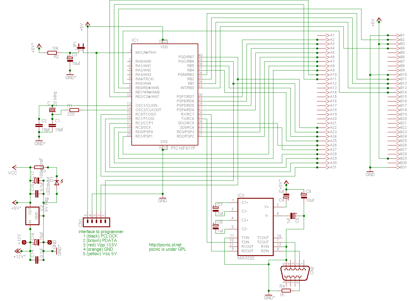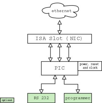 PICs and NICsThe list of components you need to get a "picnic compatible" board isn't that long. Summarized in one sentence: take a PIC, connect it to an ISA ethernet card (hosting a network interface controller, short NIC) and plug in the network cable. A PIC is a member of Microchip's popular PICmicro (TM) line of microcontrollers. I decided to work with a PIC 16F877. Most important, the 16F877 series has a large number of I/O ports. So it is possible to connect the microcontroller's inputs without any sophisticated interface logic one by one to the ISA slot. Also, build-in USART support (RS 232), 8 KB of Flash EEPROM and an A/D converter are big advantages. Two disadvantages of this PIC are on the one hand its 8 bit architecture, which causes some nice overhead when parsing 16-bit based network protocols, and on the other hand the limited RAM (368 bytes). But I didn't want to miss my experience with PICs in this project. At the beginning of the project I looked for an ISA ethernet card with a well documented onboard chip. In order to make things not worse as they are anyway the card had to be a 8 bit ISA card. The ISA bus protocol is easy to implement and the 8-bit mode of the card reduces comlpexity of the PIC (also 8 bit logic) - NIC interface. The first (and probably not the worst) card I could get was a ISA NE-2000 compatible card with a Realtek 8019AS chip. Working with this card turned out to be really fine (though the lack of direct memory access makes reading/writing data slow as well as expensive). Documentation is available at Realtek (poor infos on basic operations) and at National Semiconductor (really good NE-2000 description). I set up a FAQ page to explain in detail which cards are "picnic compatible". This card has an onboard EEPROM - an ATMEL AT93C46 - where configuration values and PnP information are stored [top]the curcuit layoutThe PIC with power supply, reset circuit and clock source has to be seen as the main unit of the curcuit layout. If you want to keep it simple you only have to add the 36 pin ISA slot for the ethernet card. This configuration is sufficient to run picnic successfully. I added two more components to this basic setup (green in graphics below): First, I connected the PIC to a serial port of my computer, to realize some kind of a debug information port (MAX 232). Second, five programming lines enable in-circuit-programming of the PIC. ![]() Detailed schematics can be found here Schematics and board were made using Eagle, an Eletronic CAD Software that runs under Windows and Linux. We used the Free version of it, that allows schematics design, has a powerfull auto router for the board layout, and allows boards up to 100 x 80 mm. Thanks to Peter Target who made the board layout and corrected some errors in the schematics. Eagle Schematics: picnic.sch Step by step assembly can be done following some steps: As you can see in the detailed version of the circuit layout, I left as many PORTA I/O pins unconnected as possible. These pins are on the one hand ordinary digital I/O pins and on the other hand input sources for the integrated A/D converter. I didn't connect them in the basic layout to be able to use them in a maybe future project (A/D + ethernet). One of NIC's interrupt line is linked to RB0/INT. A rising edge on this pin causes an interrupt so that PIC can take full advantage of the interrupt capability of the ethernet card. Attention when connecting this interrupt line! You have to connect the interrupt line your card will use for interrupts! [top]remoteThis section will be added as soon as possible. Meanwhile, this page gives you an idea what remote is able to do (see the screenshot - shows an example working session). A full list of all remote commands is given when help or ? is entered in the command line. [top]PIC software in generalAll the PIC software is written in assembler. I have to admit I never had a look at a PIC compiler, but I think the complexity of the picnic project justifies the use of pure assembler. My PIC assembler of choice is the GNU PIC assembler (gpasm), an intended open source replacement for Microchip's MPASM assembler (btw, the picnic sources also compile well with MPASM). In order to have a chance to understand my own programs, the sources are very well documentated (at least from my point of view). So if the following documentation of the PIC programs looks poor, go on and read the comments in the source. [top]nicshellnicshell was the first PIC software I wrote within the scope of the picnic project. It is based on serial communication between a PC and the PIC; that's why you have to connect the picnic board somehow to a serial port of your workstation (see chapter the circuit layout for details) if you want to use nicshell (this is developing software. if you just want a webserver, you won't need a serial line). If you are looking for a computer program doing the job described below, give remote a try (or any other terminal program).