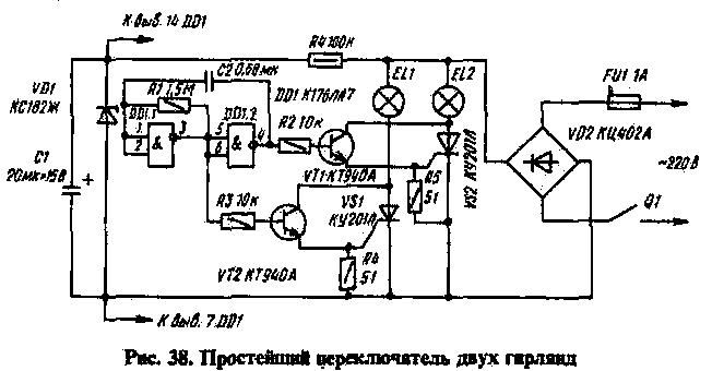 Простейший переключатель поочередно коммутирует две гирлянды (рис. 38). На логических элементах DD1.1, DD1.2 выполнен генератор, а на транзисторах VT1, VT2 собраны высоковольтные ключи для управления тринисторами VS1, VS2. Питание на микросхему подается от параметрического стабилизатора R4VD1 с конденсатором С1. Постоянное напряжение как для микросхемы DD1, так и для ламп гирлянд EL1, EL2 снимается с выпрямительного моста VD2.