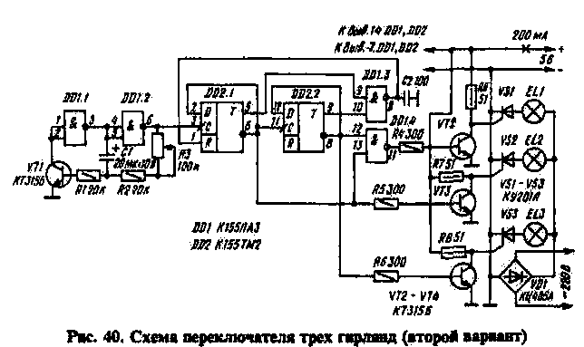 Недостатком переключателя является необходимость применения трансформаторного блока питания. Это обусловлено сравнительно большим током, потребляемым микросхемами К155ЛАЗ и К155ТМ2. Существенно уменьшить ток потребления можно, применив КМОП-микросхемы, в этом случае питание микросхем может осуществляться от простейшего параметрического стабилизатора, как это сделано в переключателе двух гирлянд (см. рис. 38).