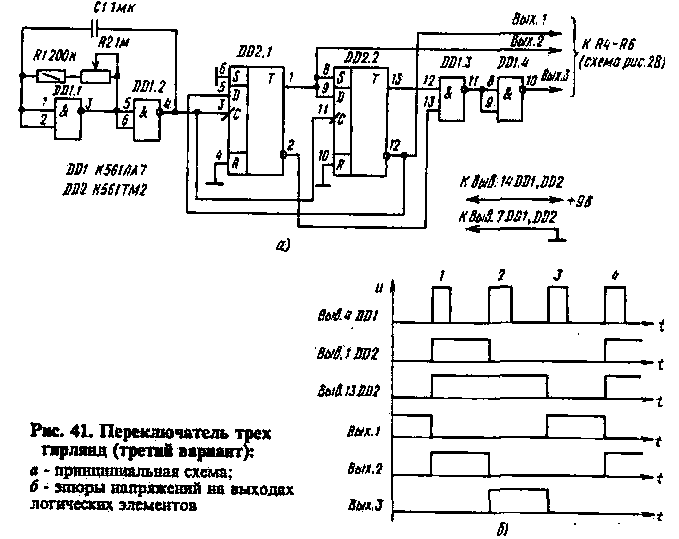 Схема переключателя трех гирлянд (третий вариант) на микросхемах серии К561 представлена на рис. 41,а. Генератор выполнен на логических элементах DD1.1, DD1.2, а счетчик с коэффициентом пересчета 3 - на двух D-триггерах микросхемы DD2. Эпюры напряжений на выходах логических элементов показаны на рис. 41,6. Они помогут понять логику работы устройства. Транзисторно-тринисторные ключи для управления гирляндами, выпрямитель и стабилизатор для питания микросхем - такие же, как и в переключателе по схеме рис. 39 (в качестве стабилитрона VD1 в этом случае нужно использовать КС191Ж или Д814В).