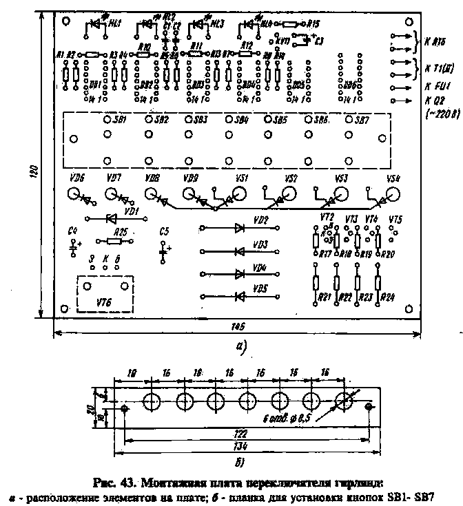 Монтаж выполнен проводами. Транзистор VT6 установлен на дюралюминиевом уголке площадью около 30 см^2 (он служит радиатором). Диоды VD6-VD9 и тринисторы VS1-VS4 установлены на плате без радиаторов, при этом суммарная мощность переключаемых ламп не должна превышать 500 Вт. Кнопки SB1- SB7 (типа КМ1-1) установлены: на планке из текстолита (рис. 43,6), которая крепится к основной плате двумя винтами МЗ.