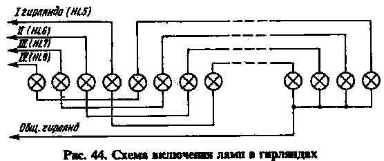 Если все детали исправны и в монтаже нет ошибок, то устройство начинает работать сразу. Следует отметить, что достигаемые световые эффекты во многом зависят от взаимного расположения ламп гирлянд. Наиболее распространенным является такое их расположение, когда за лампой первой гирлянды следует лампа второй гирлянды, затем третьей, четвертой и т. д. На рис. 44 показана схема такого включения ламп.