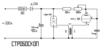 Настройка такая: Если на конденсаторе есть напряжение (около 300в), тиратрон(МТХ-90)мигает,а стробоскоп не вспыхивает, значит:1)либо неработает трансформатор 2)либо тиратрон накрылся 3)Либо где-то неправильно собрано.