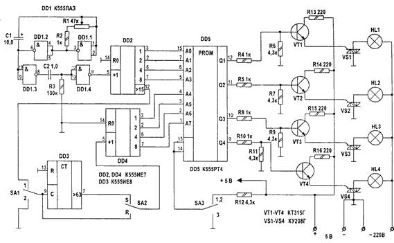 С тактового генератора, собранного на микросхеме DD1 (К555ЛА3). поступают тактовые импульсы на вход счетчика DD2 (К555ИЕ7). Выходы счетчика соединены с адресными входами ППЗУ. Таким образом, счетчик DD2 обеспечивает последовательное обращение к шестнадцати ячейкам памяти ППЗУ, которые задают световые комбинации для одной программы. С помощью счетчика DD3 обеспечивается повторение каждой программы 64 раза.