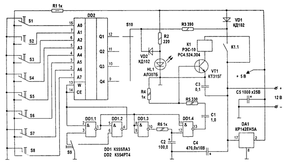 Схема собрана на пяти микросхемах и питается от стабилизированного источника +5 В. Основой схемы является однократно программируемая микросхема К556РТ4, которую можно запрограммировать самостоятельно с помощью несложного программатора (рис.2).