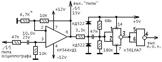 С гнезда "вых.вч." высокочастотный сигнал ( напряжение 0-0,25V )подаётся на вход исследуемого устройства. Переменным резистором регулируется необходимый уровень выхода вч. С выхода устройства сигнал подаётся на детекторную головку "Дет.головка" , с выхода которой детектированый сигнал подаётся на вход Y осциллографа. Переменным резистором "част" устанавливается центральная частота, а резистором "девиация" - ширина полосы качания ( до 20Мгц ). На вход "и.о.х." подаются отрицательные импульсы в момент обратного хода луча. На вход " пилы " подаётся пилообразное напряжение. Выход " мет.вых " подать на " вх.мет" измерительной головки. Регулируется и амплитуда меток. Генератор меток внутренний - на 1Мгц и 10Мгц. При необходимости на вход " мет.внеш " можно подать другую частоту. Импульсы обратного хода переключая триггер, чередуют через строку первоначальное положение луча и АЧХ. Такое сочетание характеристик позволяет видеть АЧХ относительно её нуля. Формирователь "и.о.х." и пилообразного напряжения из из выходного сигнала развёртки осциллографа изображён ниже.