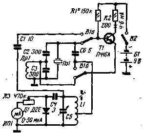 Схема этого комбинированного прибора приведена на рисунке. Наличие в нем встроенного кварцевого калибратора значительно расширяет возможности применения и повышает точность измерений. Имеется также возможность нанести сетку калиброванных частот на шкалу волномера. В нижнем (по схеме) положении переключателя В1 ВЧ колебания через конденсатор С6 подаются на контур волномера И момент его настройки на частоту кварца или его гармонику фиксируется по максимальному отклонению стрелки микроамперметра. Настройка контура на первую гармонику вызывает появление максимальной амплитуды В Ч напряжения на контуре, так что чувствительность индикатора приходится уменьшать с помощью резистора R3. С повышением номера гармоники, на которую настраивается контур, амплитуда ВЧ колебаний уменьшается.
