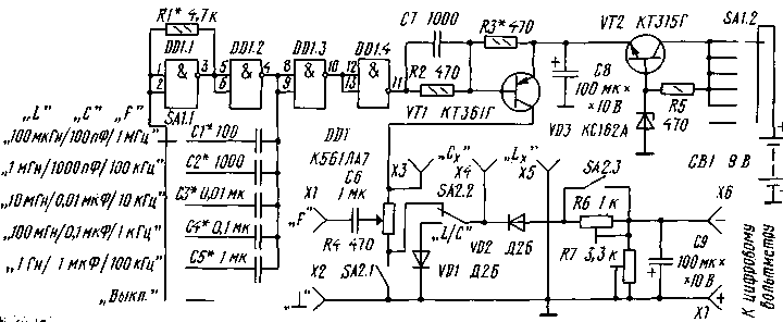 Технические характеристики прибора: диапазон измеряемой емкости (мкФ) от 80 х 10-6 до 25 х 10 3; диапазон измеряемой индуктивности (Гн) от 2,5 х 10-6 до 40; диапазон измеряемых частот (Гн) от 1 до 16 х 10 6. Схема измерителя показана на рисунке. На элементах DD1 и DD2 собран генератор, времязадающим элементом которого являеться измеряемая емкость или индуктивность. На элементах DD3 и DD4 собран делитель частоты с коэффициентом деления 16777211. Вся шкала прибора включает 25 значений, отличающихся друг от друга в 2 раза. При работе прибора визуально определяют, частота мигания какого светодиода ближе всего к 1 Гц. Показания напротив него и являются результатом измерения.