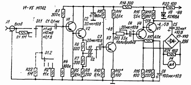 Следующий каскад милливольтметра - усилитель напряжения ЗЧ на транзисторе V3 (коэффициент усиления примерно 30) - обеспечивает возможность измерения малых напряжений. С выхода этого каскада усиленное напряжение ЗЧ поступает на вход измерителя напряжения переменного тока с линейной шкалой, представляющей собой двухкаскадный усилитель (V4, V5), охваченный отрицательной обратной связью через выпрямительный мост (V7-V10). В диагональ этого моста включен микроамперметр Р1.