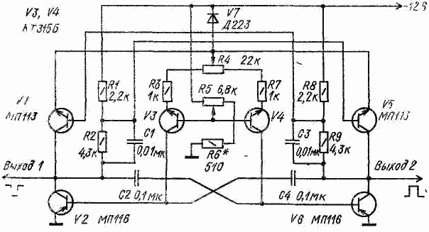 Порог срабатывания ключевых каскадов определяется диодом V7. Изменение скважности импульсов осуществляется переменным резистором R4, а перестройка частоты - резистором R5.