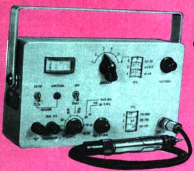 Рис.1. Внешний вид прибора Весь диапазон разбит на 6 поддиапазонов (140-330; 315-780; 715-1800 кГц; 1,6-4,6; 4,4-12,5; 11,3-30 МГц). Напряжение генератора ВЧ - 100 мВ. Частота генератора НЧ (модулятора) - 1000 Гц, выходное напряжение - 0,5-0,6 В. Максимальная глубина модуляции на частотах до 11 МГц - 60%, свыше 11 МГц - 80%. Изменение глубины модуляции плавное. Имеется отдельный выход низкочастотного генератора. Габариты прибора - 210х120х65 мм. Масса прибора с высокочастотным кабелем и аттенюатором - 1,7 кГ (длина кабеля - 1 м). Градуировка шкалы частот генератора на первых пяти поддиапазонах произведена при выходном напряжении высокочастотного сигнала 100 мВ, на шестом поддиапазоне - при напряжении 80 мВ.