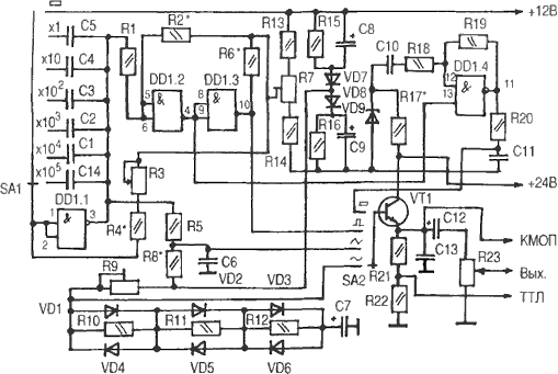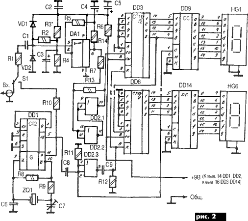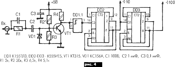 Частотомер (рис.2) выполнен но микросхемах, имеет функцию самоконтроля, цифровую индикацию. Основные параметры частотомера Пределы измеряемой частоты ....... 5...100000 (1000000) Гц Чувствительность не хуже ......... 120 мВ Входное сопротивление не менее ... 1 МОм Число разрядов индикатора ........ 5 (6) Частота обновления показаний ..... 1 Гц В авторском варианте прибор имеет пять разрядов индикатора. В данной конструкции добавлен шестой разряд индикатора и исключен звуковой контроль измеряемой частоты (R13, DD2.2, НА1 [2]). Питается устройство от блока питания типа "ступенька", собранного на интегральных стабилизаторах по классической схеме (рис.3). При необходимости измерения более высокой частоты устройство можно дополнить простым делителем частоты (рис.4), собранном на микросхемах ТТЛШ [3, 4]. Для изготовления данной конструкции использован пластмассовый корпус польского производства типа Z1. Стоимость всей конструкции на радиорынке в сентябре 2002 г. не превышала 130 грн.