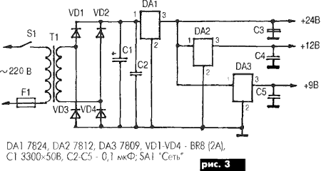 Детали функционального генератора и частотомера соответствуют авторскому описанию [1, 2]. В блоке питания использован трансформатор Т1 мощностью 15...20 Вт (см рис.3), напряжение вторичной обмотки 27...30 В при токе до 0,6 А (в случае использования делителя частоты). Диодный мост VD12-VD15 малогабаритный импортного производства на ток 1,5...2 А. Электролитические конденсаторы импортного производства. Переключатели SA1-SA3 малогабаритные типа ПГ2-1-6 П1НТ или аналогичные импортного производства. В качестве выходных гнезд использованы гнезда типа "тюльпан" импортного производства Стабилизаторы 7812, 7809 можно заменить КРЕН12Б, КРЕН12А соответственно. Стабилизаторы необходимо установить на радиаторы, особенно 7824. В делителе частоты можно использовать микросхемы серии К155, но при этом ток потребления значительно возрастет. Наладка схем генератора и частотомера подробно описана в авторских вариантах [1, 2]. Правильно собранный блок питания наладки не требует Наладку делителя частоты осуществляют с помощью эталонных генератора и частотомера, проверяя коэффициенты деления частоты. Осциллографом просматривают выходные импульсы делителя частоты. Литература 1. Ладыка А. Несложный функциональный генератор//Радио. — 1992.