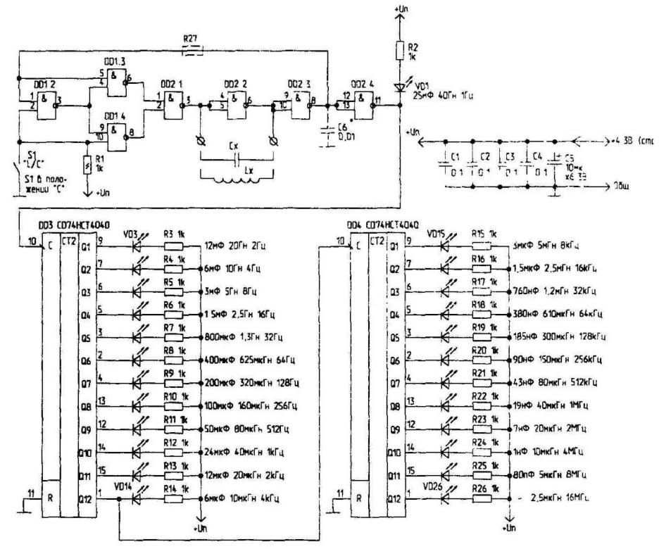 На микросхеме DD1, резисторе R1 и кварцевом резонаторе ZQ1 собран генератор импульсов частотой 1 МГц, на микросхемах DD3...DD7 - делители частоты на "10", а на элементах VD1...VD4, RP1, RP2, С1, R6, R7-преобразователь. На выходе преобразователя, обозначенном "V-", напряжение изменяется пропорционально величине подключенной емкости или индуктивности (к контактам "СХ" или "LX1" соответственно). Сигнал частотой 6 МГц формируется генератором на элементах DD8.1, DD8.2.Импульсы с этого генератора поступают на специальный преобразователь, напряжение на выходе которого меняется пропорционально подключенной к разъему "LX2" индуктивности. Преобразователь выполнен на элементах R10...R12, VD7, RP4, RP3, С7, Сб. С его выхода ("V-") на вольтметр подается напряжение, пропорциональное индуктивности, подключенной к разъему "LX2"; третий генератор выполнен на ZQ3. Он вырабатывает импульсы частотой 10 МГц. Сигнал с этого генератора подается на преобразователь, напряжение которого меняется пропорционально подключенной к клеммам "LX3" индуктивности. Параметры приставки Диапазон измерения емкости, мкФ . 0,1*10-6...12 Диапазон измерения индуктивности, Гн 0,02*10-9...1,2 Погрешность измерения емкости, %, не более ±1,5 Погрешность измерения индуктивности, %, не более ±5 Преобразователь для этого поддиапазона выполнен на элементах R14, R15, RP5, VD8, С6, С7. Функции подстроечных элементов: - RP1 -установка показаний индуктивности в диапазонах 1 ...б; - RP2 - установка показаний емкости в диапазонах 1...6; - RP3 - предварительная установка в диапазонах "LX2" и "LX3"; - RP4 - установка показаний индуктивности в диапазоне "LX2"; - RP5 - установка показаний индуктивности в диапазоне "LX3". Подстройку необходимо производить сначала резистором RP1. Показания в диапазонах "LX2" и "LX3" не зависят от положения резисторов RP1 и RP2. При измерении в диапазонах "LX2" и "LX3", при отсутствии измеряемой индуктивности, стрелка вольтметра не устанавливается на "нулевую" отметку, а показывает величину 3...5 В (это не влияет на точность показаний). При работе прибора в диапазонах 1 ...б его можно питать от маломощного 9-вольтового аккумулятора (ток потребления - не более 12 мА). В диапазонах "LX2" и "LX3" необходим отдельный блок питания с напряжением 7...15 В (ток потребления -порядка 100 мА). Цена деления и частота измерения для разных диапазонов приведены в таблице.