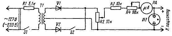 Детали.Трансформатор Т1 собран на сердечнике из пермаллоя Ш6 X 8. Первичная обмотка содержит 1000 витков провода ПЭВ-0,08, вторичная - (1000 + 1000) витков того же провода. Для обеспечения хорошей изоляции обмоток друг от друга их выполняют на отдельных каркасах, располагая на крайних стержнях сердечника. Неоновая лампа типа МН-3 служит для защиты от перегрузки по току. Сопротивление R1 остеклованное, проволочное, мощностью " 10 Вт. От его величины зависит форма и длительность импульсов. Величина тока и напряжения регулируется резисторами R4 и R2 соответственно. Миллиамперметр рассчитан на ток до 2 мА. Перед применением прибора необходимо его проверить на пробой испытательным напряжением в 3 кВ между первичной и вторичной обмотками трансформатора, а