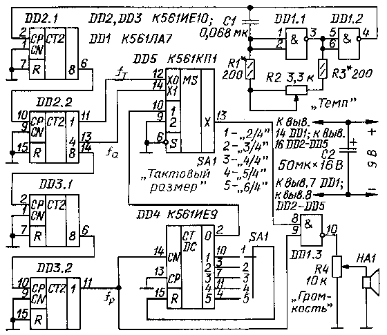 Ведущий генератор (см. схему рис. 1), собранный на элементах DD1.1, DD1.2, вырабатывает импульсную последовательность, скважность которой близка к 2. Делитель частоты на счетчиках DD2.1, DD2.2, DD3.1 DD3.2 формирует три выходных сигнала с частотой тона fт, акцента fa и рабочей частотой fр. Импульсы с частотой fр поступают на вход С счетчика-дешифратора DD4, который в зависимости от положения переключателя SA1 выбора тактового размера пропускает на выход 0 каждый второй, третий, четвертый и т. д. импульсы. Они управляют работой мультиплексора DD5 по входу 1. В зависимости от логического уровня сигнала на этом входе на выход мультиплексора попеременно будет проходить сигнал либо с частотой fт, либо fа. В результате этого на выходе мультиплексора будет непрерывный сигнал звуковой частоты, состоящий из двух составляющих - fт и fа.