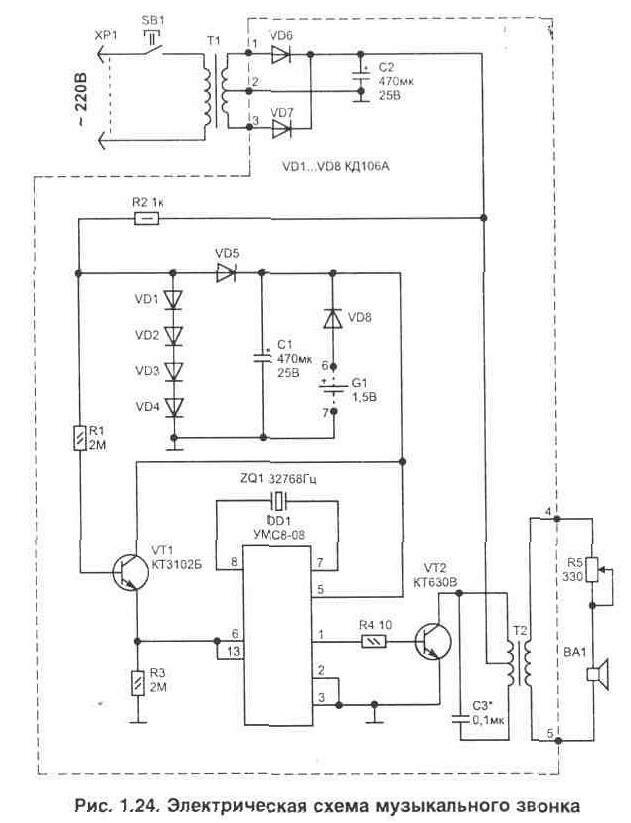 В отличии от уже опубликованных вариантов музыкальных сигнализаторов, в приведенной на рис. 1.24 схеме не требуется использовать дополнительную кнопку для переключения мелодии. Смена мелодии происходит автоматически при каждом очередном нажатии на кнопку звонка (SB1). Каждая мелодия будет звучать, пока нажата кнопка.