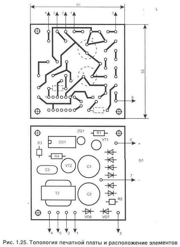 Все детали, выделенные на схеме пунктиром, расположены на печатной плате размером 55х55 мм, показанной на рис. 1.25. Микросхему DD1 удобнее установить на контактной панели, что в дальнейшем позволит сменить набор мелодий без перепайки платы легко заменив только саму микросхему.