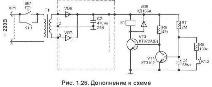 Для того чтобы продолжительность проигрывания мелодии не зависела от того, сколько времени нажата кнопка вызова, в схему можно установить таймер, рис. 1.26. Он выполнен на двух транзисторах VT3, VT4 и реле К1. Таймер позволяет увеличить время исполнения мелодии до 6...7 с после отпускания кнопки (время зависит от номинала конденсатора С4).