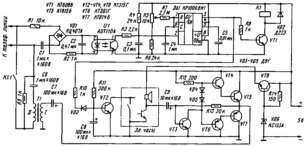 При появлении высокого уровня на выходе таймера диод VD3 закроется и начнется зарядка конденсатора С8 через резистор R11. Цепь R11C8 задает паузу перед "ответом" часов. Затем откроется транзистор VT2 и зашунтирует кнопку "ответа" на часах. С выхода часов звуковой сигнал поступает на усилитель, который собран на транзисторах VT3- VT7. Он подробно описан в [2]. Через трансформатор Т1 сигнал с выхода усилителя поступает в телефонную линию.