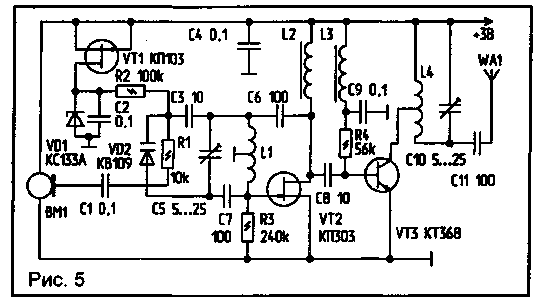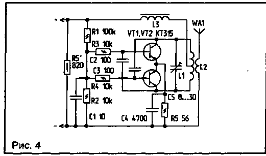 В передатчике стационарного аппарата (рис.4) резистор R5 включается в разрыв одного из проводов телефонной сети. При снятии трубки телефонного аппарата или включении режима автоподнятия в цепи появляется ток, который в зависимости от типа аппарата и состояния линии находится в пределах 10...35 мА. Этот ток, протекая через резистор R5, вызывает на нем падение напряжения порядка 15... 18 В, которое питает передатчик. Автогенератор передатчика собран по обычной двухтактной схеме, на транзисторах VT1 и VT2. Частотная модуляция происходит за счет изменения напряжения в линии и, как следствие, изменения напряжения на базах транзисторов. Частота задается параметрами контура L1, С5. Катушка L1 наматывается на полистирольном каркасе диаметром 5 мм и содержит 4 витка провода ПЭВ 0,5 мм с отводом от середины. Катушка L2 наматывается поверх L1 и имеет 2 витка того же провода. Настройка производится при занятой телефонной линии путем подстройки контура L1, С5.