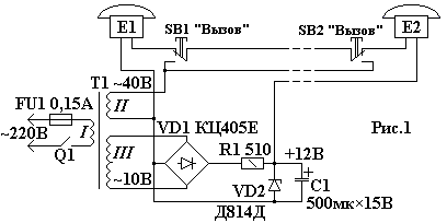 Переговорные устройства обеспечивают телефонную связь между двумя абонентами. Вызов осуществляется через звонок, имеющийся в телефонном аппарате. В таких переговорных устройствах можно использовать телефонные аппараты, у которых исправны лишь трубка, звонок и рычажный переключатель. Телефонные аппараты Е1 и Е2 (рис.1) соединяют трехпроводной линией, в которую подают переменное и постоянное напряжения. Переменное напряжение снимают с обмотки II сетевого трансформатора Т1, постоянное - с параметрического стабилизатора напряжения (R1, VD2, CD двухполупериодного выпрямителя (VD1) питание которого осуществляется от обмотки III трансформатора.