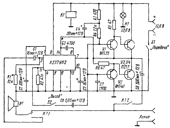 Выполнен переговорный автомат на одной микросхеме типа К237УН2 и четырех транзисторах V1 типа МП39≈МП42, V2 типа МП35≈ МП38, V3, V4 типа П213≈П217. В режиме приема автомат отключен от своего источника питания, а динамик через нормально замкнутые контакты K1.2 подключен к линии. У другого корреспондента, имеющего аналогичный переговорный автомат, должна быть включена кнопка "Передача". При этом подается питание на усилитель, контакты реле К1.2 подключают выход усилителя к линии, а контакты К1.1 подключают динамик ко входу усилителя. Кнопка "Вызов" переводит усилитель в режим генерации низкочастотных колебаний.