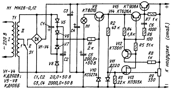 Нестабильность выходного напряжения стабилизатора обычно складывается из нестабильности образцового напряжения и дрейфа ОУ. В описываемом стабилизаторе она определяется в основном только температурным дрейфом первого активного элемента. Стабилизатор (см. схему) состоит из двух усилителей с динамической нагрузкой с последовательным управлением. Первый собран на транзисторах V13, V12, где V13 включен по схеме с общим затвором, а V12 - с общим коллектором; второй - на транзисторах V14, V15 (V14 - с общим эмиттером, а V15 - с общим коллектором). Сигнал обратной связи с движка резистора R9, приложенный к истоку транзистора V13, усиливается без инвертирования фазы и поступает на базу транзистора V14. Транзистор V13 работает в режиме, близком к отсечке тока. Напряжение между истоком и затвором является в стабилизаторе образцовым. Цепь R2R3V11 служит только для температурной компенсации изменения тока стока транзистора V13 (без нее при замкнутом на общий провод затворе этого транзистора выходное напряжение стабилизатора изменяется на 3...5 % в температурном интервале 20... 50 °С). С коллектора транзистора V14 проинвертированный и усиленный сигнал передается на базу мощного регулирующего транзистора V15. Управляющий элемент питается от параметрического стабилизатора на стабилитроне V10 и транзисторе V9. Для получения более высокого коэффициента использования напряжения основного выпрямителя (см. статью "Улучшение маломощных стабилизаторов напряжения" - "Радио", 1981, № 10, с. 56) V1 - V4 стабилизатор на транзисторе V9 питается от умножителя напряжения на диодах V5-V8 и конденсаторах С1, С2. Умножитель подключен ко вторичной обмотке трансформатора Т1. Лампа Н1 служит для ограничения коллекторного тока через транзисторы V9, V14 и базового тока транзистора V15 при коротком замыкании в цепи нагрузки, а также для индикации перегрузки. В момент перегрузки вследствие возрастания базового тока транзистора V15 происходит снижение напряжения на входе параметрического стабилизатора до уровня 30 В, где это напряжение почти полностью падает на лампе Н1 за вычетом падения напряжения на транзисторах V9, V14 и эмиттерном переходе транзистора V15. Ток по этой цепи не превышает 120...130 мА, что меньше предельно допустимого для ее элементов. В стабилизаторе использован проволочный переменный резистор с допустимой мощностью рассеивания 3 Вт (ППБ-3, ПП3-40). Транзистор V13 необходимо подобрать с малым значением начального тока стока - только тогда нижняя граница выходного напряжения стабилизатора будет близка к 1 В. Ток стока этого транзистора при напряжении между стоком и истоком 10 В и затворе, замкнутом на исток, должен быть в пределах 0,5...0,7 мА. При монтаже стабилизатора между диодом V11 и транзистором V13 необходимо обеспечить хороший тепловой контакт, для чего достаточно склеить их корпусы. Транзистор V15 желательно выбрать с большим статическим коэффициентом передачи тока базы. Кроме указанных на схеме, можно использовать кремниевые транзисторы серий КТ203, КТ208, КТ209, КТ501, КТ502, КТ3107 (V12), КТ814, КТ816 (V14), транзисторы КТ815, КТ817 с любым буквенным индексом, КТ807Б (V9),КТ803А, КТ808А, КТ819 с любым буквенным индексом (V15). В стабилизаторе можно применить и германиевые транзисторы МП40А, а также любые из серий МП20, МП21, МП25, МП26 (V12), ГТ402, ГТ403, П213-П215 (V14). Вместо КС527А можно применить стабилитроны Д813, Д814Д (по два последовательно), Д810