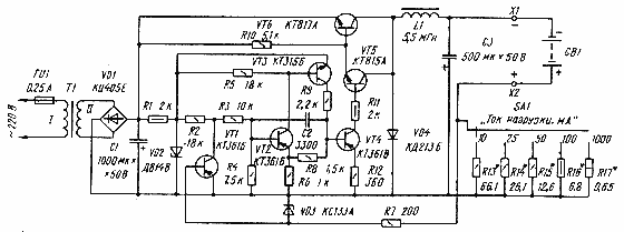 Работает устройство следующим образом. При включении питания конденсатор С3 разряжен, транзистор VT1 закрыт, мультивибратор генерирует импульсы, следующие с частотой около 20 кГц. Усиленные транзистором VT4, импульсы мультивибратора открывают составной транзистор VT5VT6. Когда этот транзистор открыт, ток течет через него, дроссель L1, нагрузку GB1, подключенную к разъемам X1 и Х2, резисторы Р13-R17 (в зависимости от выбранного переключателем SА1 предела зарядного тока) и конденсатор С3. При закрывании транзистора VT4 ток самоиндукции дросселя L1 замыкается через коммутирующий диод VD4, конденсатор С3, нагрузку и резисторы R13-R17.