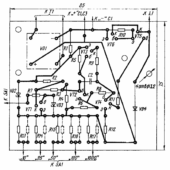 Большая часть деталей описанного зарядного устройства смонтирована на печатной плате (рис.2) из фольгированного стеклотекстолита толщиной 2 мм. Транзистор VT6 установлен на теплоотводе площадью 25 кв.см, к нему прижат транзистор VT5. На плате предусмотрены места для резисторов, подключаемых параллельно резисторам R13-R17 при подгонке необходимых токов зарядки.