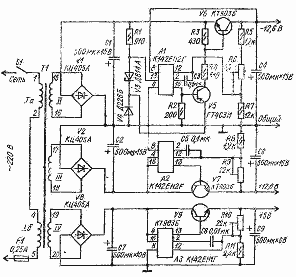 Блок питания для аналоговых и цифровых микросхем состоит из трех стабилизированных выпрямителей, два из которых образуют двуполярный источник напряжения 12,6 В с раздельным регулированием.