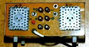 На задней панели находятся радиаторы с транзисторами VT1 и VT3, предохранитель, клеммы выходного напряжения, тумблер включения блока питания в сеть, тумблер переключения вольтметра, кнопка “Сброс защиты”.