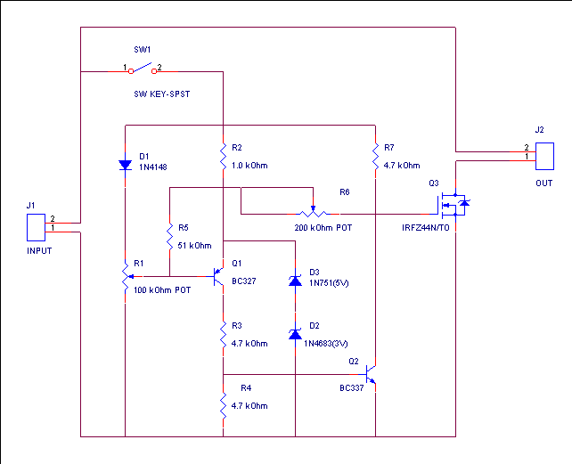Порог срабатывания регулируется потенциометром R1. Приведенная ниже схема рассчитана на номинальное напряжение 16 Вольт, порог срабатывания 12-13 Вольт. Напряжение включения регулируется потенциометром R6. Если планируется работа с нагрузками около 5-х ампер, транзистор Q3 желательно установить на небольшой радиатор.