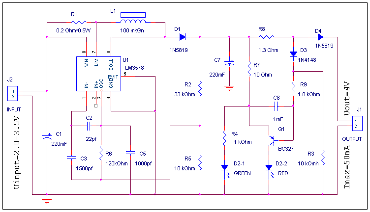 Схема представленная на рисунке представляет собой простой импульсный преобразователь напряжения на повышение. Входное напряжение 2-3 вольта, что дает возвожность использовать в качестве источника питания две батареи. Индикатор протекания тока собран на светодиодах D2-1, D2-2. Если не требуется индикация, их можно исключить. Ток потребления ограничиваетя величиной сопротивления R1. Одно из возвожных областей применения - зарядное устройство для сотовых телефонов.