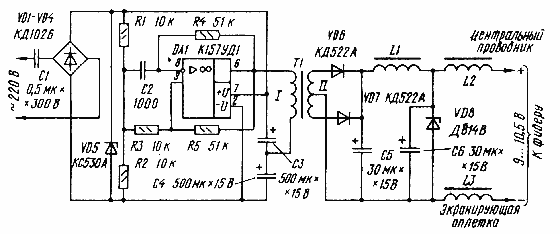 Диоды VD1-VD4 могут быть КД105Б- КД105Г,Д226Б или выпрямительный блок КЦ402А-КЦ402Г, КЦ404А- КЦ404Г, а VD6-VD7 - Д219А, Д310, Д311, Д312, КД510А, КД521А - КД521Г. Стабилитрон VD5 можно составить из нескольких последовательно включенных стабилитронов с суммарным напряжением стабилизации 30...35 В. Стабилитрон VD8 - на напряжение стабилизации 9... 10,5 В и с максимальным постоянным током стабилизации до 25 мА.