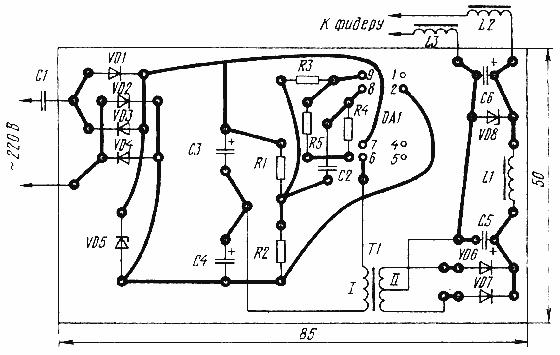 Все детали блока, кроме конденсатора С1 и дросселей L2, L3, размещают и монтируют на печатной плате (рис.2). Дроссели L2 и L3 включают навесным способом между платой и разъемом для подключения усилителя, а конденсатор С1 крепят на отдельной плате.