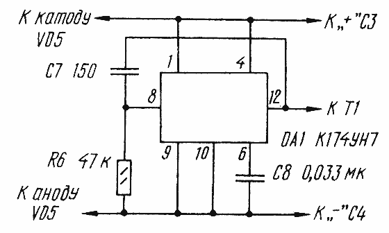 В импульсном генераторе можно также использовать микросхему К174УН7, включив ее по схеме, приведенной на рис.4. Но тогда надо будет вдвое уменьшить число витков первичной обмотки трансформатора, в два раза увеличить емкость конденсатора С1 и применить стабилитрон VD5 на напряжение стабилизации 15...17 В.
