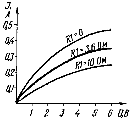 Схема подключения транзистора к блоку питания приведена на рис.1, а вольт-амперные характеристики транзистора для различных сопротивлений резистора R1 - на рис.2. Работает защита так. Если сопротивление резистора равно нулю (т. е. исток соединен с затвором), а нагрузка потребляет ток около 0,25 А, то падение напряжения на полевом транзисторе не превышает 1,5 В, и практически на нагрузке будет все выпрямленное напряжение. При появлении же в цепи нагрузки КЗ ток через выпрямитель резко возрастает и при отсутствии транзистора может достичь нескольких ампер. Транзистор ограничивает ток короткого замыкания на уровне 0,45...0,5 А независимо от падения напряжения на нем. В этом случае выходное напряжение станет равным нулю, а все напряжение упадет на полевом транзисторе. Таким образом, в случае КЗ мощность, потребляемая от источника питания, увеличится в данном примере не более чем вдвое, что в большинстве случаев вполне допустимо и не отразится на "здоровье" деталей блока питания.