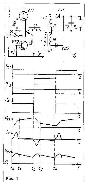 Рассмотрение начнем с момента to, когда открывается транзистор VT1 и через него, а также через дроссель L1 и первичную обмотку трансформатора Т1 начинает заряжаться конденсатор С1. В этот момент напряжение на конденсаторе С2 и нагрузке Rн меньше напряжения (Uпит-Uc1)n-UD, где Uc1 - напряжение на конденсаторе С1; n - коэффициент трансформации трансформатора Т1; UD - прямое падение напряжения на выпрямительном диоде VD1 (или VD2). При этом диод VD1 открыт и через него проходит ток зарядки конденсатора С2.